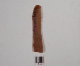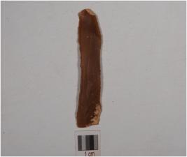 | Description / विवरण | A chert stone blade, having mid ridge on dorsal surface, ventral has prominet bulb and use marks at edge. |