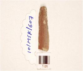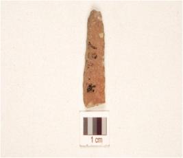 | Description / विवरण | A fragment of a blade made on chert, ridge on the dorsal, bulb on ventral, and use marks on along working edges. |