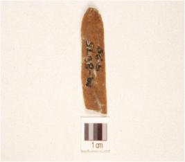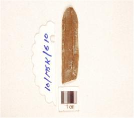 | Description / विवरण | A fragment of parallel sided blade, made on chert, ridge on dorsal, diffused bulb on ventral, and use marks on along working edge. |