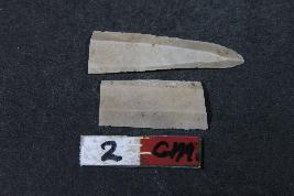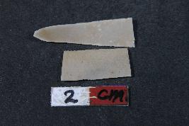 | Description / विवरण | Fragment of blades with two dorsal ridges having smooth surface and shorter blade has Length- 1.8 cm, Breadth- 0.8 cm |