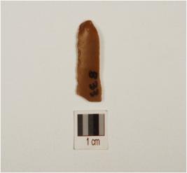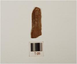 | Description / विवरण | Fragment of chert blade with double ridge on dorsal, striking platform on proximal end, diffused bulb on ventral, trapezoidal cross section, use wear marks on cutting edge and broken along distal end. |