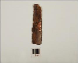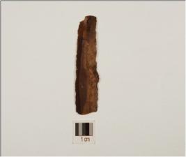 | Description / विवरण | Fragment of chert blade with double ridges on dorsal, trapezoidal cross section irregular rectouhes on cutting edges and broken along both ends. |