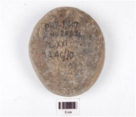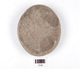 | Description / विवरण | A hammer stone made of quartzite, circular in shape, rough surface, slightly chipped off edge and pitting marks visible on the periphery. |