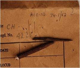 | Description / विवरण | Copper pin which is broken in two piece and , pointed ends, corroded surface. |