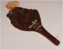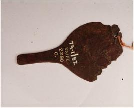 | Description / विवरण | Copper piece of spear head, thin in character and edges are corroded, handle is pointed. |