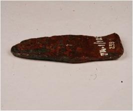 | Description / विवरण | Copper dagger one end is conical and other end flat, formation of patina on surface is broad and other end. |