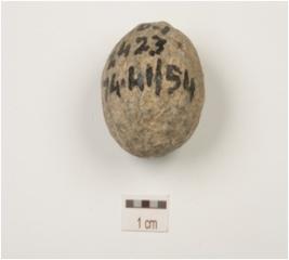 | Description / विवरण | A sling ball made of stone, circular cross section and rough surface. |