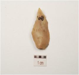 | Description / विवरण | A point, made of chert, bulb on the ventral side, pointed along one end and retouched cutting edges. |