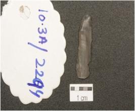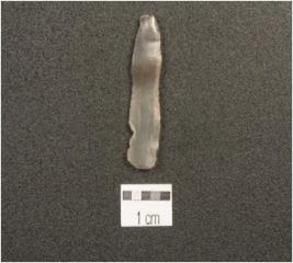 | Description / विवरण | A blade made on chalcedony, ridges on dorsal side, bulb of percussion on ventral side, prepared platform, use wear marks on the cutting edges. |