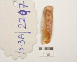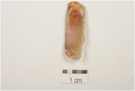 | Description / विवरण | A blade made on carnelian, one ridge on dorsal side, bulb of percussion on ventral side, use wear marks on the cutting edges, prepared platform, cortex on surface. |