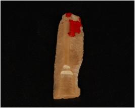 | Description / विवरण | Chert blade with two ridges, trapezoidal in section and use-ware marks along the cutting edges and ripple marks on the dorsal side. |