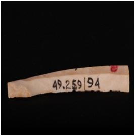 | Description / विवरण | Fragment of Parallel sided chert blade with two ridges use-wear marks on cutting edges and trapezoidal section. |