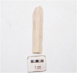 | Description / विवरण | Blade made on chert, trapezoid in shape, double ridge on dorsal side and use marks on edges. |