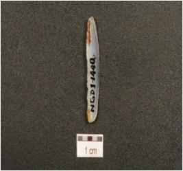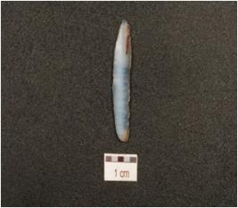 | Description / विवरण | A chalcedony blade with prominent mid ridge on dorsal, prepared platform, triangular cross section and irregular retouches on cutting edge. |