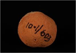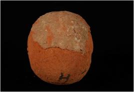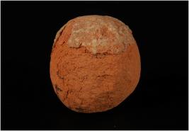 | Description / विवरण | A handmade terracotta sling ball, circular in shape, rough surface, chipped off from surface. |