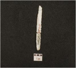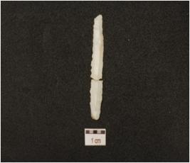 | Description / विवरण | Fragment of chert blade with double ridge on dorsal, diffused bulb on ventral, striking platform, trapezoidal cross section and use wear marks on cutting edge. |
