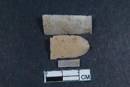 | Description / विवरण | Fragments of blades with two dorsal ridges in two of them and one dorsal ridge in one of them. One of them is 2.4cm in length and 1.5cm in breadth. One of them have bulb of percussion and they have smooth surface. |