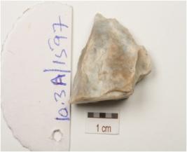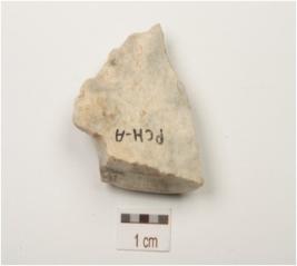 | Description / विवरण | End struck chert flake with wear marks along cutting edge, chipping dorsal surface, positive bulb on ventral surface. |