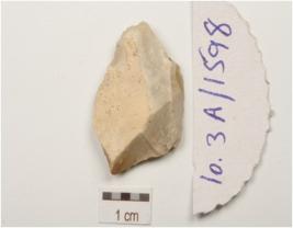 | Description / विवरण | End struck chert utilized flake, flake scars on dorsal surface, wear marks along cutting edges, negative bulb on ventral surface. |