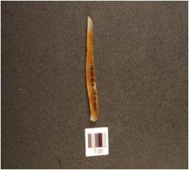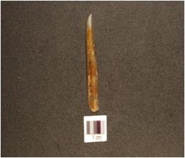 | Description / विवरण | A pen knife blade, made of chalcedony, double ridge on dorsal, trapezoidal cross-section and use-wear marks on cutting edge. |