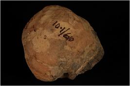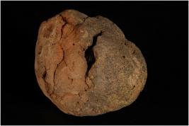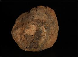 | Description / विवरण | A handmade terracotta sling ball, uneven circle shaped, rough surface, partly broken. |