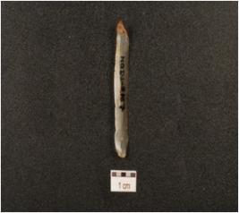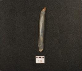 | Description / विवरण | A chalcedony blade with double ridge on dorsal, bulb on ventral, striking platform, trapezoidal cross section and broken along distal end. |