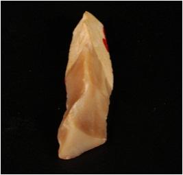 | Description / विवरण | Chert blade wavy mid-ridge on a dorsal side, distal and proximal end is broken and triangular section. |
