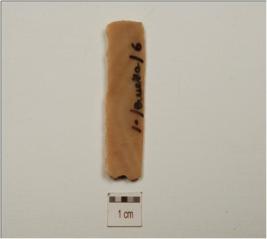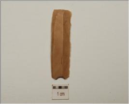 | Description / विवरण | A broken chert blade with double ridge on dorsal and use marks on the cutting edges. |