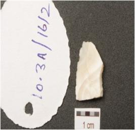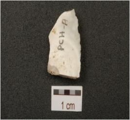 | Description / विवरण | Utilized flake on end struck chert flake, prominent bulb on ventral surface, flake scars on dorsal surface, wear marks along cutting edge. |