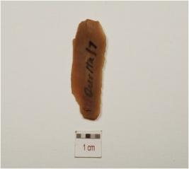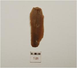 | Description / विवरण | A chert blade with prominent bulb on ventral prepared platform on the proximal end , mid ridge on dorsal ,and use marks on the cutting edges. |