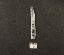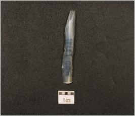 | Description / विवरण | A chalcedony backed blade with double ridge on dorsal, prepared platform, trapezoidal cross section and backed along left lateral cutting edge. |