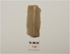 | Description / विवरण | A broken chert blade with middle ridge on dorsal and use marks on the cutting edges. |