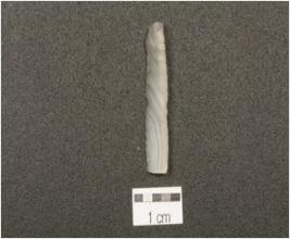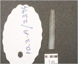 | Description / विवरण | A chalcedony blade, triangular cross section, prepared platform, prominent bulb on ventral side, distal end broken and use marks along the cutting edges. |