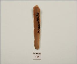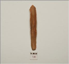 | Description / विवरण | A chert blade withdiffused bulb on ventral prepared paltform on the proximal end mid ridge on dorsal and use marks on cutting edges. |
