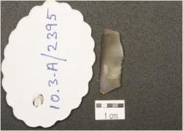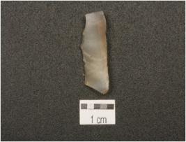 | Description / विवरण | A chalcedony blade, triangular cross section, prepared platform, bulb absent, distal end broken and use marks along the cutting edges. |