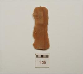 | Description / विवरण | A chert blade with double ridge on dorsal and trapezoidal cross section with use marks on cutting edge. |
