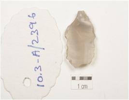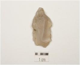 | Description / विवरण | End struck utilized chalcedony flake, trapezoidal cross section, prepared platform, prominent bulb on ventral side and use marks along the cutting edges. |