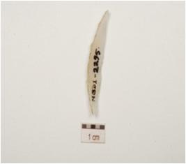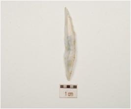| Description / विवरण | A chalcedony crescent with mid ridge on dorsal, triangular cross section, backed along one side and pointed along both ends. |