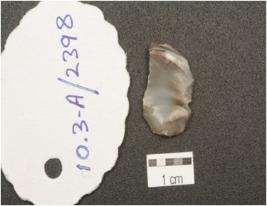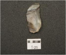 | Description / विवरण | End struck chalcedony flake, triangular cross section, prepared platform, prominent bulb and ripple marks on ventral side and use-marks on edges. |
