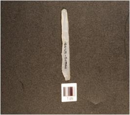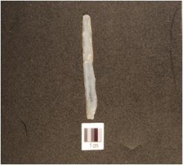 | Description / विवरण | A chalcedony blade with double ridge on dorsal, use-wear marks on cutting edge and trapezoidal cross-section. |