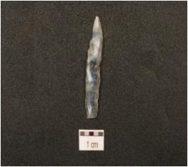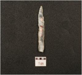 | Description / विवरण | A chalcedony blade with mid ridge on dorsal, triangular cross section, irregular retouches on cutting edge and prepared platform. |