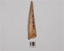 | Description / विवरण | A bone point with a pointed working end, has smooth and polished surface, partly damaged and rectangular section. |