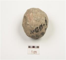 | Description / विवरण | A sling ball made of stone, circular cross section and rough surface. |
