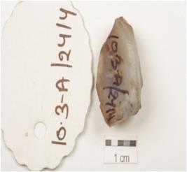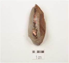 | Description / विवरण | Core made on chalcedony, prepared platform and blade scars on surface. |