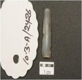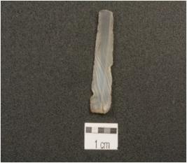 | Description / विवरण | Blade made on chalcedony, prepared platform, prominent bulb on ventral side and triangular cross section, use marks along the cutting edge. |