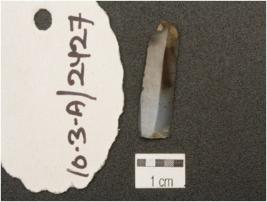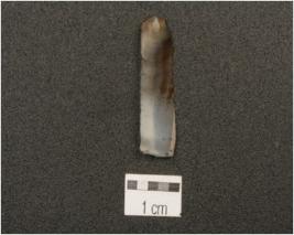 | Description / विवरण | Blade made on chalcedony, prominent bulb on ventral side, prepared platform and triangular cross section. |