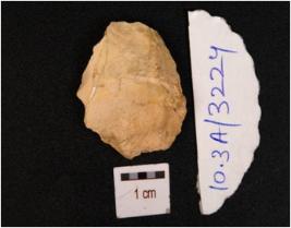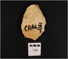 | Description / विवरण | A flake made on chert, having flake scar on surface, irregular edges and shape, prominent bulb on ventral. |