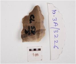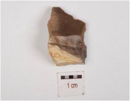 | Description / विवरण | A utilized flake made on chert, having flake scars on surface, irregular edges, uneven shape and edges. |