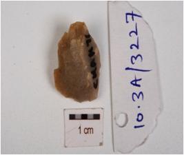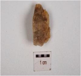 | Description / विवरण | A utilized flake made on quartz, having flake scars on surface, irregular edges, uneven shape and edges. |