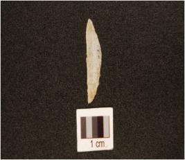 | Description / विवरण | A chalcedony backed point with mid ridge on dorsal, use-wear marks on cutting edge and triangular cross-section. |